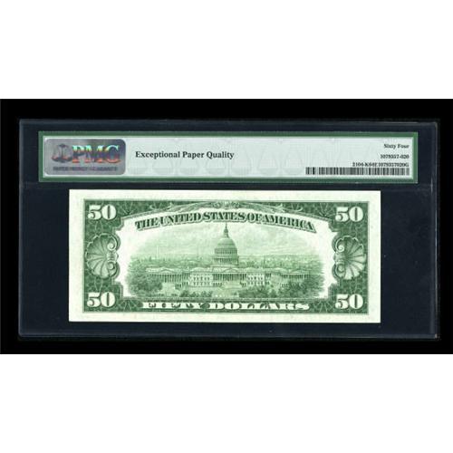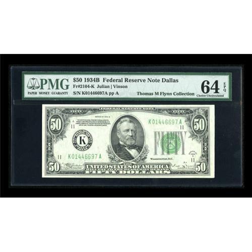 <B>Fr. 2104-K $50 1934B Federal Reserve Note. PMG Choice Uncirculated 64 EPQ.</B></I><BR> This piece comes from the Dallas district, the scarcest along with Minneapolis in this series. It is the only Dallas district example graded to date by PMG.<BR><I>From The Thomas M. Flynn Collection</B></I><BR><BR><b>Shipping:</b> Coins & Currency (<a target="_blank" href="http://www.heritageauctions.com/common/shipping.php">view shipping information</a>)