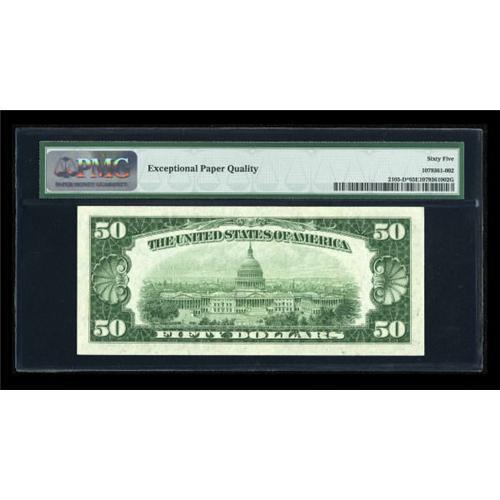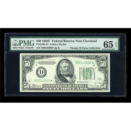 <B>Fr. 2105-D* $50 1934C Federal Reserve Note. PMG Gem Uncirculated 65 EPQ.</B></I><BR> This rare star catalogues for $1500 in Choice in the new Schwartz and Lindquist reference. This is the only example of this star we have seen in anywhere near this grade and the only example that PMG has graded to date in any grade. This note may well surprise.<BR><I>From The Thomas M. Flynn Collection</B></I><BR><BR><b>Shipping:</b> Coins & Currency (<a target="_blank" href="http://www.heritageauctions.com/common/shipping.php">view shipping information</a>)