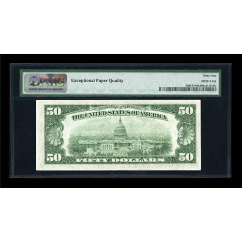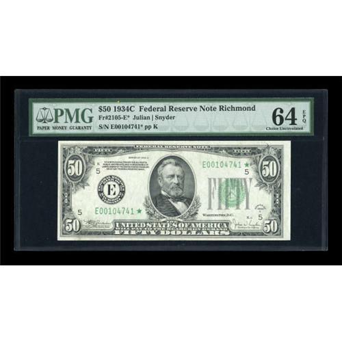 <B>Fr. 2105-E* $50 1934C Federal Reserve Note. PMG Choice Uncirculated 64 EPQ.</B></I><BR> The delicate embossing of the Treasury Seal is visible on the back of this wholly original issue. To date, this is only the second uncirculated example of this scarce star that we have had the privilege of offering.<BR><BR><b>Shipping:</b> Coins & Currency (<a target="_blank" href="http://www.heritageauctions.com/common/shipping.php">view shipping information</a>)