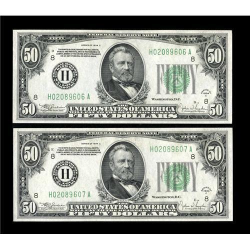 <B>Fr. 2105-H $50 1934C Federal Reserve Notes. Two Consecutive Examples Choice About Uncirculated.</B></I><BR>This St. Louis pair possesses plenty of embossing and deep ink, but each has suffered a light center bend. The first note becomes the lowest serial by one in the Schwartz/Lindquist guide.<BR><BR><b>Shipping:</b> Coins & Currency (<a target="_blank" href="http://www.heritageauctions.com/common/shipping.php">view shipping information</a>)