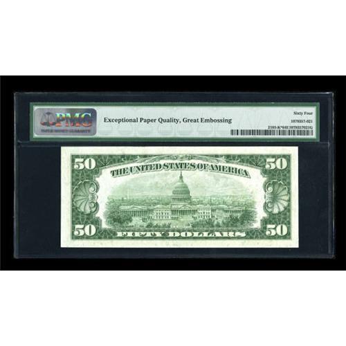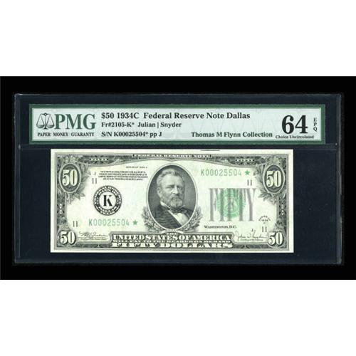 <B>Fr. 2105-K* $50 1934C Federal Reserve Note. PMG Choice Uncirculated 64 EPQ.</B></I><BR> A beautiful note which PMG has graded Choice Uncirculated 64 EPQ with the added comment "Great Embossing." All of the known Dallas district star examples are clustered in a small group between serial numbers K00025502* and K00025507*, a total of just six pieces. This example, bearing serial number K00025504*, fits right into the middle of that group. <BR><I>From The Thomas M. Flynn Collection</B></I><BR><BR><b>Shipping:</b> Coins & Currency (<a target="_blank" href="http://www.heritageauctions.com/common/shipping.php">view shipping information</a>)