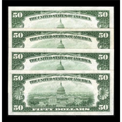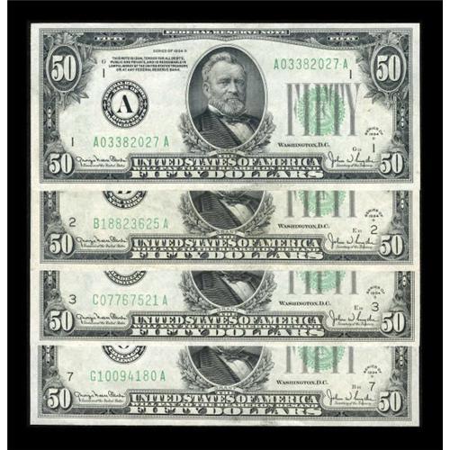 <B>Fr. 2106-A; B; C; G $50 1934D Federal Reserve Notes. Choice Crisp Uncirculated.</B></I><BR> The B note shows a little handling and it clocks in at <B>AU.</B></I><BR><I>From The Thomas M. Flynn Collection</B></I><BR><BR><b>Shipping:</b> Coins & Currency (<a target="_blank" href="http://www.heritageauctions.com/common/shipping.php">view shipping information</a>)