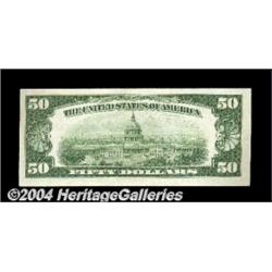 Fr. 2106-E* $50 1934-D Federal Reserve Note. Choice Crisp Uncirculated.An excessively rare star note that might well be unique, as no star examples are listed in this very rare series for the Richmond district in the Oakes reference. With even the "common" district 1934D star fifties bringing $6000-$10000 in this grade when they make their very infrequent appearances, this bright and most attractive example could easily bring a runaway price tonight. <BR><BR><B>Important notice:</B> Heritage usually auctions material at the rate of 200-250 lots per hour. On some occasions eBay Live bid software or the Internet may not be able to keep up with the pace of the auction. We recommend placing a realistic absentee bid now as insurance to avoid disappointment. Occasionally the auctioneer may eliminate or reject an eBay Live bid, and the auctioneer may also reopen a lot after the close of the eBay live bidding (usually because we missed an audience bid), and may reject your bid even if it shows you as the winning bidder. By bidding via eBay Live, you agree that Heritage may award the lot to another bidder at its sole discretion under the circumstances described above or any other reasonable circumstances. Since eBay bids are not shown to us until we open the lot on the floor, we treat those bids just like floor bids. In most cases the floor responds before the eBay bid is presented to us, due to Internet lag time, so for consistency we have made it a policy that floor bids are always considered first over tie eBay live bids. Also please note that all Heritage lots purchased through eBay Live carry a 20% Buyer's Premium. Please make sure you read the Terms and Conditions before you bid. <BR><BR><B>IMPORTANT ANNOUNCEMENT ABOUT RESERVES:</B> Heritage now divulges all reserves on its web site 7 days before every auction. If you want to know whether the reserve on this lot has been met, and if not, what the reserve amount is, please visit this lot page on the HeritageCoin.com web site, or email: bid@HeritageGalleries.com