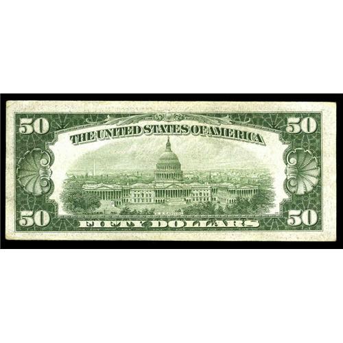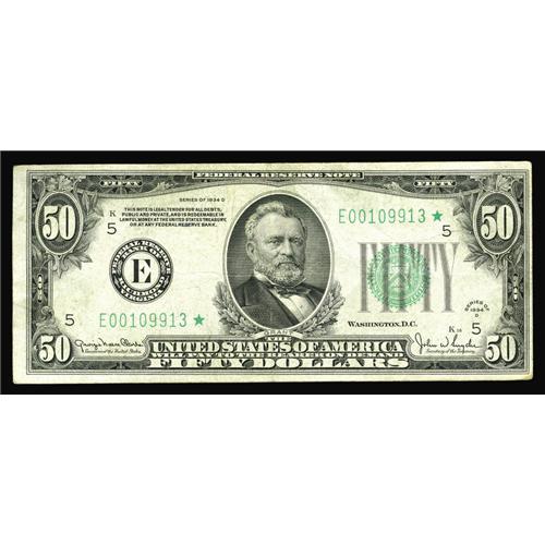 <B>Fr. 2106-E* $50 1934D Federal Reserve Note. Very Fine.</B></I><BR>The recently released sixth edition of Oakes-Schwartz shows this note as the new low serial number as another note claims the high serial number spot. The previous edition of Oakes-Schwartz did not report any 1934D Stars for Richmond. All 1934D $50 Stars are scarce with this evenly circulated and problem free piece probably capable of reaching or exceeding...