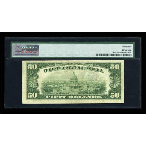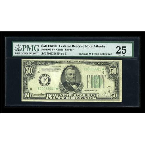 <B>Fr. 2106-F* $50 1934D Federal Reserve Note. PMG Very Fine 25.</B></I><BR> A rare district in a rare series for stars, with this district unrepresented even in the massive Taylor Family collection sale.<BR><I>From The Thomas M. Flynn Collection</B></I><BR><BR><b>Shipping:</b> Coins & Currency (<a target="_blank" href="http://www.heritageauctions.com/common/shipping.php">view shipping information</a>)