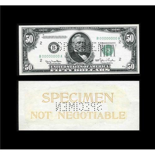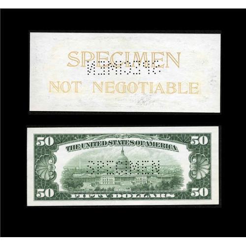<B>Fr. 2107-B $50 1950 Federal Reserve Note. Face & Back Proofs. Superb Gem Crisp Uncirculated.</B></I><BR>This a gorgeous set of face and back Proofs. Both pieces are punch cancelled with the word "Specimen" and both are flawless Proof impressions with great color and eye appeal. Each piece bears the notation "Specimen Not Negotiable" on the back, and, like all of the pieces from the set this pair originally came from, the backs have a bit of glue residue, which affects nothing.
