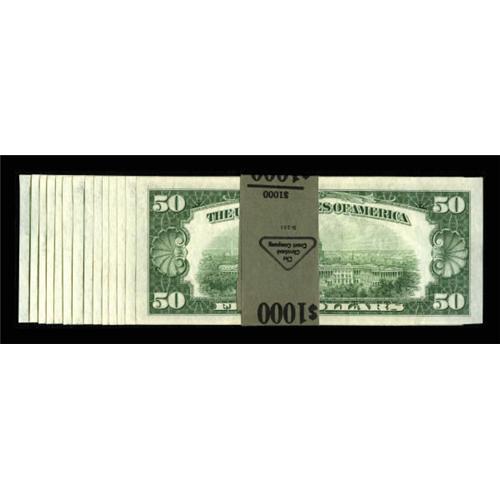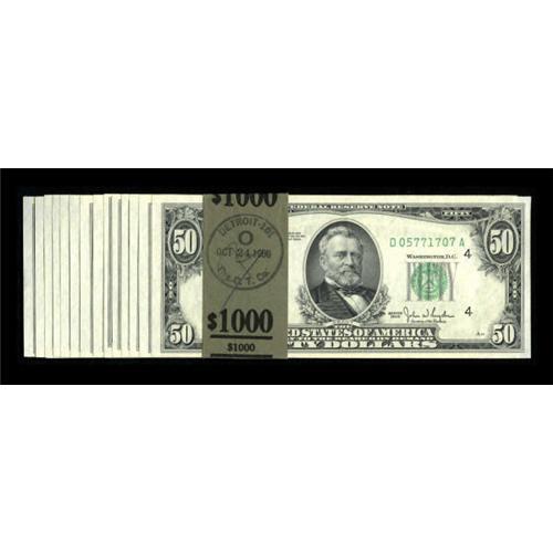 <B>Fr. 2107-D $50 1950 Federal Reserve Notes. 14 Consecutive Examples Choice Crisp Uncirculated.</B></I><BR> The first note exhibits a teller pinch while the rest have wonderful embossing present. A $1000 teller stamp dated Oct. 24, 1960 accompanies the lot.<BR><BR><b>Shipping:</b> Coins & Currency (<a target="_blank" href="http://www.heritageauctions.com/common/shipping.php">view shipping information</a>)