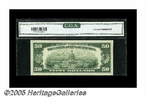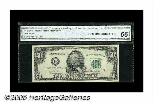 <B>Fr. 2107-G $50 1950 Mule Federal Reserve Note. CGA Gem Uncirculated 66.</B></I><BR>Wide margins that include a paper guideline marker and strong embossing define this Chicago $50.