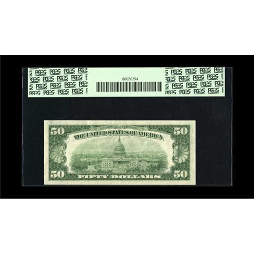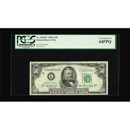 <B>Fr. 2108-H* $50 1950A Federal Reserve Note. PCGS Very Choice New 64PPQ.</B></I><BR>This is the first time a replacement note from this district has appeared in one of our sales in five years. It is two notes away from the lowest serial number in the Oakes tome.