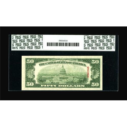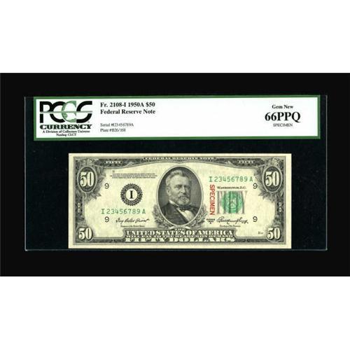 <B>Fr. 2108-I $50 1950A Federal Reserve Note Specimen. PCGS Gem New 66PPQ.</B></I><BR> It is not often enough that notes surface from old time collections that capture the attention of currency enthusiasts. This piece is just such a note. Official records indicate 384,000 Minneapolis $50's were printed for Series 1950. In January of 1953 when Priest and Humphrey assumed the roles of Treasurer and Secretary of the Treasury, there was a call for new signatures and Series 1950A began production. Notes were printed between 1953 and 1957 for all the Federal Reserve Districts except for Minneapolis and would not resume for this district until Series 1950C between January 1961 and April 1962. However, Series 1950A specimens were produced for all twelve districts including Minneapolis. This piece represents the only known opportunity to possess a Minneapolis note from this Series and is a prize for any collector specializing in this northern district's issues. A ladder serial number I23456789A graces the note and the word Specimen is printed vertically in red on the front and back. The originality is most pleasing and the margins are ample.<BR><BR><b>Shipping:</b> Coins & Currency (<a target="_blank" href="http://www.heritageauctions.com/common/shipping.php">view shipping information</a>)