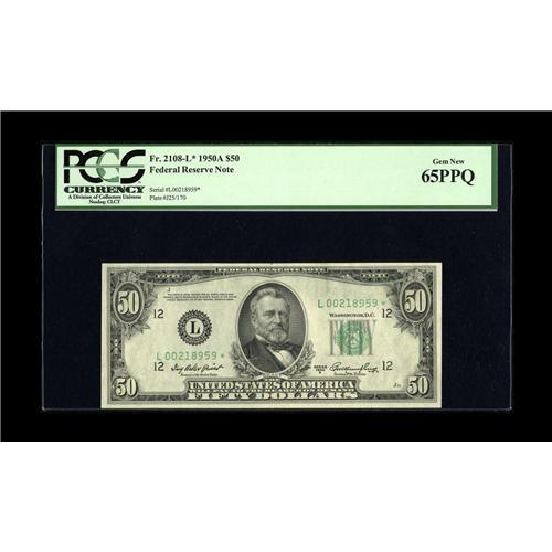 <B>Fr. 2108-L* $50 1950A Federal Reserve Note. PCGS Gem New 65PPQ.</B></I><BR>A scarce Star with decent paper quality.<BR><BR><b>Shipping:</b> Coin/Currency (<a target="_blank" href="http://www.heritageauctions.com/common/shipping.php">view shipping information</a>)