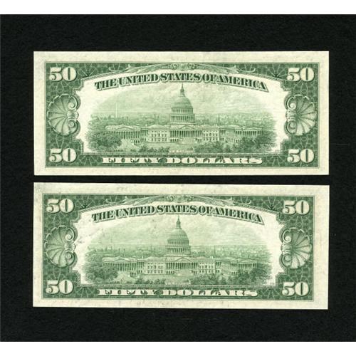 <B>Fr. 2109-B $50 1950B Federal Reserve Notes. Two Examples Very Choice Crisp Uncirculated.</B></I><BR> A wonderful pair of New York notes pulled from the same pack.<BR><BR><b>Shipping:</b> Coins & Currency (<a target="_blank" href="http://www.heritageauctions.com/common/shipping.php">view shipping information</a>)
