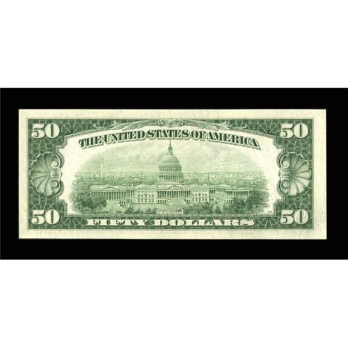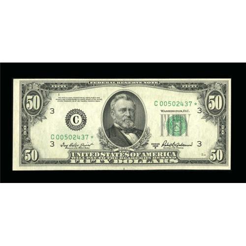 <B>Fr. 2109-C* $50 1950B Federal Reserve Note. Very Choice Crisp Uncirculated.</B></I><BR> A crackling fresh and utterly original star example which catalogues for $350 in Choice CU. With a hair better face centering, this would be a screaming Gem. <BR><BR><b>Shipping:</b> Coins & Currency (<a target="_blank" href="http://www.heritageauctions.com/common/shipping.php">view shipping information</a>)