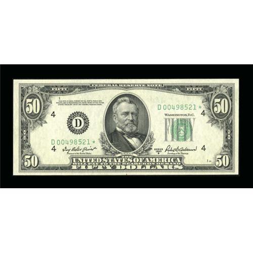 <B>Fr. 2109-D* $50 1950B Federal Reserve Note. Gem Crisp Uncirculated.</B></I><BR> A gorgeous star note with letter perfect centering, full originality, great color, and that just from the pack appearance that every collector desires. <BR><BR><b>Shipping:</b> Coins & Currency (<a target="_blank" href="http://www.heritageauctions.com/common/shipping.php">view shipping information</a>)
