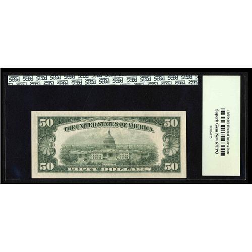 <B>Fr. 2111-D $50 1950D Federal Reserve Note. PCGS Superb Gem New 67PPQ.</B></I><BR>Suffice it to say we will call this note a "Jumbled Ladder" off Cleveland that is pack fresh.