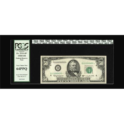 <B>Fr. 2111-D* $50 1950D Federal Reserve Star Note. PCGS Very Choice New 64PPQ.</B></I><BR>An attractive well centered example of this high denomination Cleveland district star.