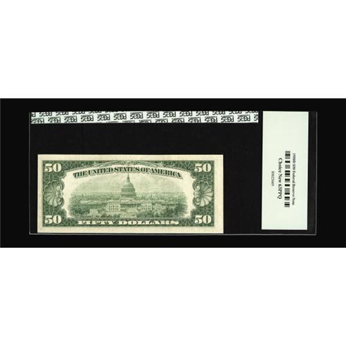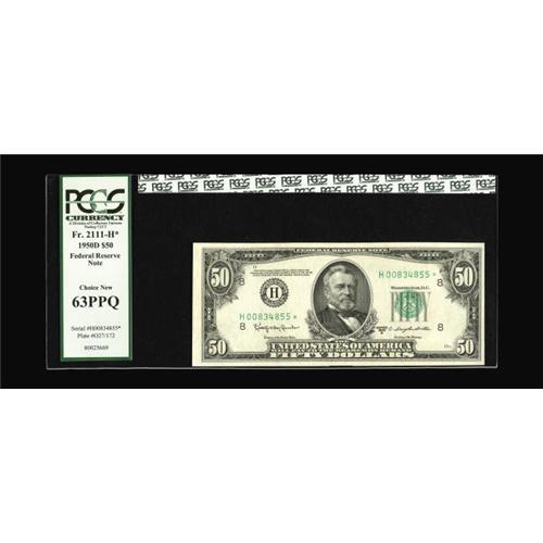 <B>Fr. 2111-H* $50 1950D Federal Reserve Star Note. PCGS Choice New 63PPQ.</B></I><BR>This St. Louis star has better back centering than front, thus the awarded grade of 63PPQ.