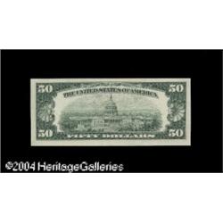 Fr. 2112-B $50 1950-E Federal Reserve Note. Choice Cris <B>Fr. 2112-B $50 1950E Federal Reserve Note. Choice Crisp Uncirculated.</B></I><BR>A short series produced by only three districts. This is a nice example with good eye appeal and decent margins. <BR><BR><B>Important notice:</B> Heritage usually auctions material at the rate of 200-250 lots per hour. On some occasions eBay Live bid software or the Internet may not be able to keep up with the pace of the auction. We recommend placing a realistic absentee bid now as insurance to avoid disappointment. Occasionally the auctioneer may eliminate or reject an eBay Live bid, and the auctioneer may also reopen a lot after the close of the eBay live bidding (usually because we missed an audience bid), and may reject your bid even if it shows you as the winning bidder. By bidding via eBay Live, you agree that Heritage may award the lot to another bidder at its sole discretion under the circumstances described above or any other reasonable circumstances. Since eBay bids are not shown to us until we open the lot on the floor, we treat those bids just like floor bids. In most cases the floor responds before the eBay bid is presented to us, due to Internet lag time, so for consistency we have made it a policy that floor bids are always considered first over tie eBay live bids. Also please note that all Heritage lots purchased through eBay Live carry a 20% Buyer's Premium. Please make sure you read the Terms and Conditions before you bid. This lot is being auctioned in conjunction with a live floor auction by Heritage Galleries & Auctioneers. All final auction and invoice information will be supplied by Heritage Galleries & Auctioneers, and all other information should be considered preliminary. Lot:16429