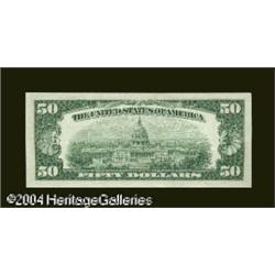 Fr. 2112-B $50 1950-E Federal Reserve Note. Gem Crisp U <B>Fr. 2112-B $50 1950E Federal Reserve Note. Gem Crisp Uncirculated.</B></I><BR>A scarce series which had printing from only three districts. <BR><BR><B>Important notice:</B> Heritage usually auctions material at the rate of 200-250 lots per hour. On some occasions eBay Live bid software or the Internet may not be able to keep up with the pace of the auction. We recommend placing a realistic absentee bid now as insurance to avoid disappointment. Occasionally the auctioneer may eliminate or reject an eBay Live bid, and the auctioneer may also reopen a lot after the close of the eBay live bidding (usually because we missed an audience bid), and may reject your bid even if it shows you as the winning bidder. By bidding via eBay Live, you agree that Heritage may award the lot to another bidder at its sole discretion under the circumstances described above or any other reasonable circumstances. Since eBay bids are not shown to us until we open the lot on the floor, we treat those bids just like floor bids. In most cases the floor responds before the eBay bid is presented to us, due to Internet lag time, so for consistency we have made it a policy that floor bids are always considered first over tie eBay live bids. Also please note that all Heritage lots purchased through eBay Live carry a 20% Buyer's Premium. Please make sure you read the Terms and Conditions before you bid. This lot is being auctioned in conjunction with a live floor auction by Heritage Galleries & Auctioneers. All final auction and invoice information will be supplied by Heritage Galleries & Auctioneers, and all other information should be considered preliminary. Lot:16428