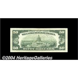 Fr. 2112-B* $50 1950-E Federal Reserve Note. Extremely Fine-About Uncirculated.A very rare series which was issued by only three districts. Even circulated stars are scarce, with high grade pieces seldom if ever available. This example is perfectly centered and appears new until very closely examined. <BR><BR><B>Important notice:</B> Heritage usually auctions material at the rate of 200-250 lots per hour. On some occasions eBay Live bid software or the Internet may not be able to keep up with the pace of the auction. We recommend placing a realistic absentee bid now as insurance to avoid disappointment. Occasionally the auctioneer may eliminate or reject an eBay Live bid, and the auctioneer may also reopen a lot after the close of the eBay live bidding (usually because we missed an audience bid), and may reject your bid even if it shows you as the winning bidder. By bidding via eBay Live, you agree that Heritage may award the lot to another bidder at its sole discretion under the circumstances described above or any other reasonable circumstances. Since eBay bids are not shown to us until we open the lot on the floor, we treat those bids just like floor bids. In most cases the floor responds before the eBay bid is presented to us, due to Internet lag time, so for consistency we have made it a policy that floor bids are always considered first over tie eBay live bids. Also please note that all Heritage lots purchased through eBay Live carry a 20% Buyer's Premium. Please make sure you read the Terms and Conditions before you bid. <BR><BR><B>IMPORTANT ANNOUNCEMENT ABOUT RESERVES:</B> Heritage now divulges all reserves on its web site 7 days before every auction. If you want to know whether the reserve on this lot has been met, and if not, what the reserve amount is, please visit this lot page on the HeritageCoin.com web site, or email: bid@HeritageGalleries.com