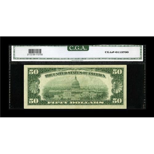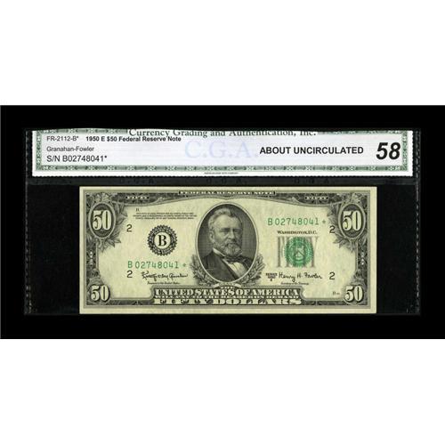 <B>Fr. 2112-B* $50 1950E Federal Reserve Note. CGA About Uncirculated 58.</B></I><BR>The faintest of center bends is noted on this 1950E star. While the bottom portion of the third party holder is still sealed, the top is open. Clearly the note belongs to the insert as the serial number is listed.<BR><BR><b>Shipping:</b> Coins & Currency (<a target="_blank" href="http://www.heritageauctions.com/common/shipping.php">view shipping information</a>)