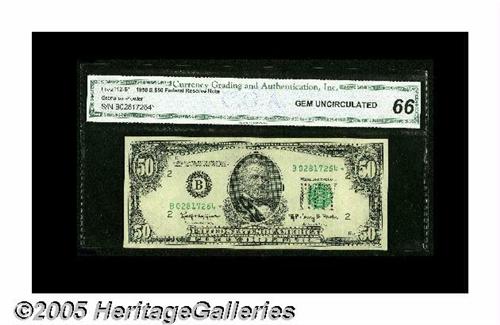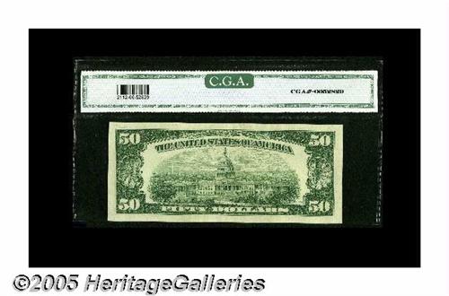 <B>Fr. 2112-B* $50 1950E Federal Reserve Note. CGA Gem Uncirculated 66.</B></I><BR>A beautifully centered example of this rare star, issued in this series by only three districts. It's been graded and slabbed by CGA, and in every respect fully appears to have earned its 66 designation.