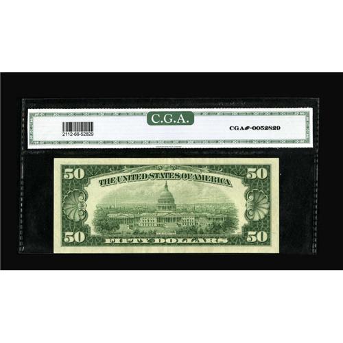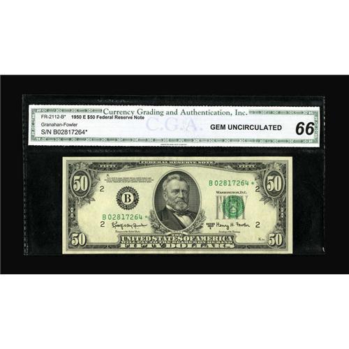 <B>Fr. 2112-B* $50 1950E Federal Reserve Note. CGA Gem Uncirculated 66.</B></I><BR>This pleasing replacement has garnered a high grade from CGA.<BR><BR><b>Shipping:</b> Coins & Currency (<a target="_blank" href="http://www.heritageauctions.com/common/shipping.php">view shipping information</a>)