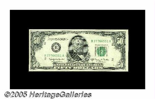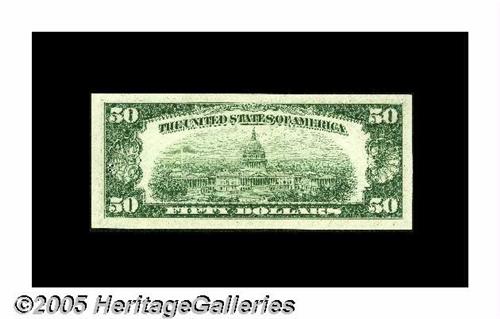 <B>Fr. 2112-B $50 1950E Federal Reserve Note. Gem Crisp Uncirculated.</B></I><BR>Please examine this note to provide a standard for future reference as to what an original and well embossed FRN should look like. They simply don't come any more original and pristine than this. Bid accordingly on this note from a scarce short series represented by only three districts.