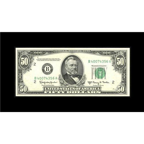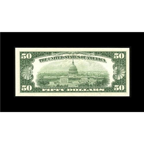 <B>Fr. 2112-B $50 1950E Federal Reserve Note. Gem Crisp Uncirculated.</B></I><BR>Only the New York, Chicago, and San Francisco districts issued this intriguing series. This was the last series printed from the wet intaglio method when the BEP brought out of mothballs the old presses to handle the need for more paper money caused by the inflation of the mid-1960s. Embossing is detected on this nicely margined example.