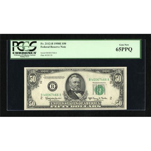 <B>Fr. 2112-B $50 1950E Federal Reserve Note. PCGS Gem New 65PPQ.</B></I><BR> This is a pleasing high end example from this scarce series.<BR><BR><b>Shipping:</b> Coins & Currency (<a target="_blank" href="http://www.heritageauctions.com/common/shipping.php">view shipping information</a>)