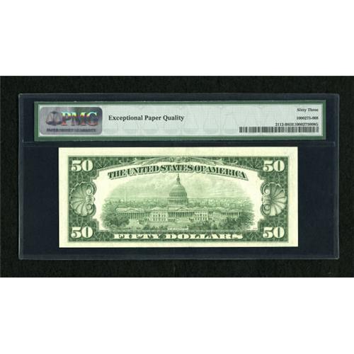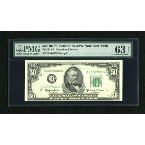 <B>Fr. 2112-B $50 1950E Federal Reserve Note. PMG Choice Uncirculated 63 EPQ.</B></I><BR> Embossing and three extra wide margins define this $50. This was the last series printed from the wet intaglio method when the BEP brought out of mothballs the old presses to handle the need for more paper money caused by the inflation of the mid-1960s. Only the New York, Chicago, and San Francisco districts issued this intriguing series. This is also the last series without the motto, "In God We Trust."<BR><BR><b>Shipping:</b> Coins & Currency (<a target="_blank" href="http://www.heritageauctions.com/common/shipping.php">view shipping information</a>)