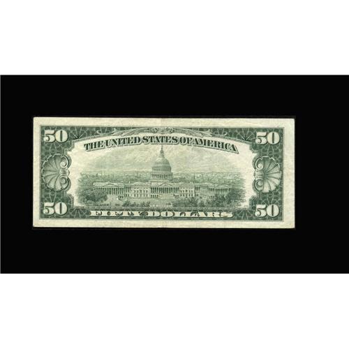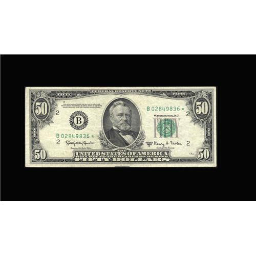 <B>Fr. 2112-B* $50 1950E Federal Reserve Note. Very Fine.</B></I><BR>Star notes from this series are avariciously coveted by collectors when they make one of their infrequent appearances at auction. This was an exceptionally short series, represented by only three districts, New York, Chicago and San Francisco. Tonight's offering is solidly within the accepted parameters for its grade and is also the high observed serial number from the New York district listed in the Oakes-Schwartz reference, <I>Standard Guide to Small Size U.S. Paper Money 1928 to Date,</B></I> which has done much to popularize the collecting of the subject area which it so ably explores. Expect spirited bidding from the community of small size specialists to resolve future guardianship of this elusive item.