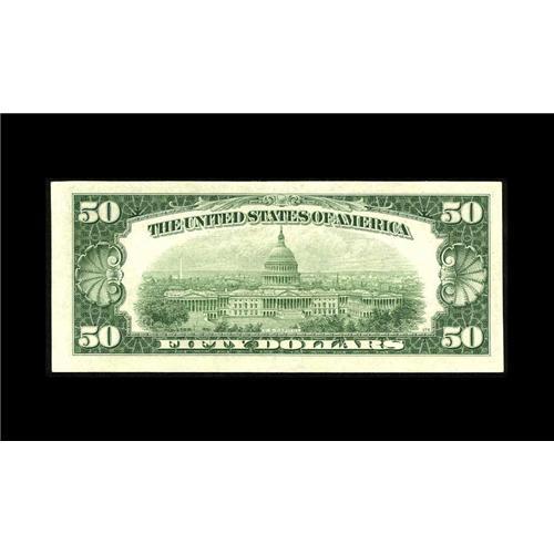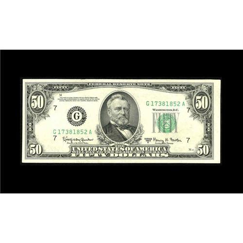 <B>Fr. 2112-G $50 1950E Federal Reserve Note. Choice Crisp Uncirculated.</B></I><BR>The upper and lower margins are even, though the horizontal centering could be better. A tough note in uncirculated condition.