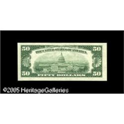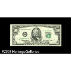 <B>Fr. 2112-G* $50 1950E Federal Reserve Note. Gem Crisp Uncirculated.</B></I><BR>This is the scarcest $50 star of the three for this enigmatic series. This example has broad margins, natural paper wave, and carries a price tag of $3000 in Oakes. It also will become a new low serial number for the Oakes opus. Lot:16271