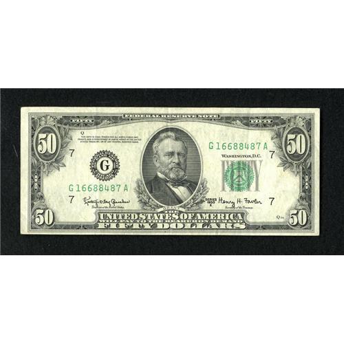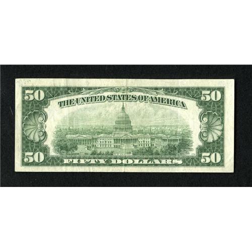 <B>Fr. 2112-G $50 1950E Federal Reserve Note. Very Fine-Extremely Fine.</B></I><BR>A lightly circulated example of this key issue that looks much closer like the higher end of the split grade.<BR><BR><I>From The Bill and Kathy Stella Currency Collection</B></I><BR><BR><b>Shipping:</b> Coins & Currency (<a target="_blank" href="http://www.heritageauctions.com/common/shipping.php">view shipping information</a>)