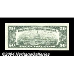 Fr. 2113-C* $50 1963A Federal Reserve Note. Gem Crisp Uncirculated.A second consecutive Gem, fully equal to the first. <BR><BR><B>Important notice:</B> Heritage usually auctions material at the rate of 200-250 lots per hour. On some occasions eBay Live bid software or the Internet may not be able to keep up with the pace of the auction. We recommend placing a realistic absentee bid now as insurance to avoid disappointment. Occasionally the auctioneer may eliminate or reject an eBay Live bid, and the auctioneer may also reopen a lot after the close of the eBay live bidding (usually because we missed an audience bid), and may reject your bid even if it shows you as the winning bidder. By bidding via eBay Live, you agree that Heritage may award the lot to another bidder at its sole discretion under the circumstances described above or any other reasonable circumstances. Since eBay bids are not shown to us until we open the lot on the floor, we treat those bids just like floor bids. In most cases the floor responds before the eBay bid is presented to us, due to Internet lag time, so for consistency we have made it a policy that floor bids are always considered first over tie eBay live bids. Also please note that all Heritage lots purchased through eBay Live carry a 20% Buyer's Premium. Please make sure you read the Terms and Conditions before you bid. <BR><BR><B>IMPORTANT ANNOUNCEMENT ABOUT RESERVES:</B> Heritage now divulges all reserves on its web site 7 days before every auction. If you want to know whether the reserve on this lot has been met, and if not, what the reserve amount is, please visit this lot page on the HeritageCoin.com web site, or email: bid@HeritageGalleries.com