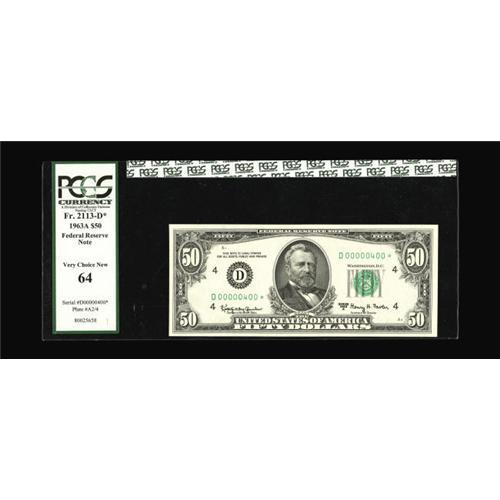 <B>Fr. 2113-D* $50 1963A Federal Reserve Note. PCGS Very Choice New 64.</B></I><BR>Serial number 400 on this tougher Cleveland district star.