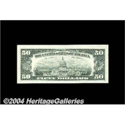 Fr. 2113-D* $50 1963A Federal Reserve Note. Choice Crisp Uncirculated.The tiniest trace of handling limits the grade on this perfectly natural Star Fifty. The first of two consecutive examples. <BR><BR><B>Important notice:</B> Heritage usually auctions material at the rate of 200-250 lots per hour. On some occasions eBay Live bid software or the Internet may not be able to keep up with the pace of the auction. We recommend placing a realistic absentee bid now as insurance to avoid disappointment. Occasionally the auctioneer may eliminate or reject an eBay Live bid, and the auctioneer may also reopen a lot after the close of the eBay live bidding (usually because we missed an audience bid), and may reject your bid even if it shows you as the winning bidder. By bidding via eBay Live, you agree that Heritage may award the lot to another bidder at its sole discretion under the circumstances described above or any other reasonable circumstances. Since eBay bids are not shown to us until we open the lot on the floor, we treat those bids just like floor bids. In most cases the floor responds before the eBay bid is presented to us, due to Internet lag time, so for consistency we have made it a policy that floor bids are always considered first over tie eBay live bids. Also please note that all Heritage lots purchased through eBay Live carry a 20% Buyer's Premium. Please make sure you read the Terms and Conditions before you bid. <BR><BR><B>IMPORTANT ANNOUNCEMENT ABOUT RESERVES:</B> Heritage now divulges all reserves on its web site 7 days before every auction. If you want to know whether the reserve on this lot has been met, and if not, what the reserve amount is, please visit this lot page on the HeritageCoin.com web site, or email: bid@HeritageGalleries.com