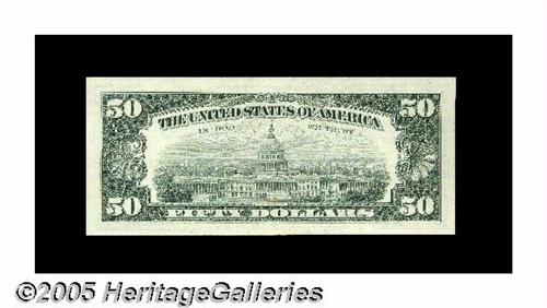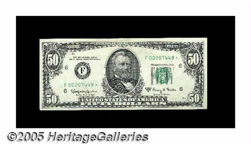 <B>Fr. 2113-F* $50 1963A Federal Reserve Note. Gem Crisp Uncirculated.</B></I><BR>Embossing is spotted on this scarce Star that is a new high serial number for the Oakes reference.