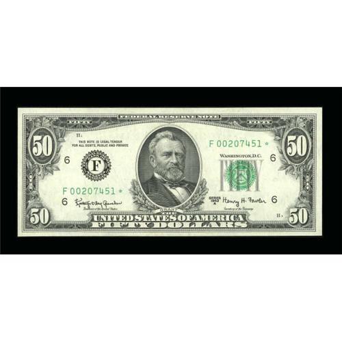 <B>Fr. 2113-F* $50 1963A Federal Reserve Note. Gem Crisp Uncirculated.</B></I><BR> A beautifully centered and fully embossed Gem star. <BR><BR><b>Shipping:</b> Coins & Currency (<a target="_blank" href="http://www.heritageauctions.com/common/shipping.php">view shipping information</a>)