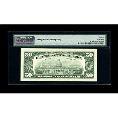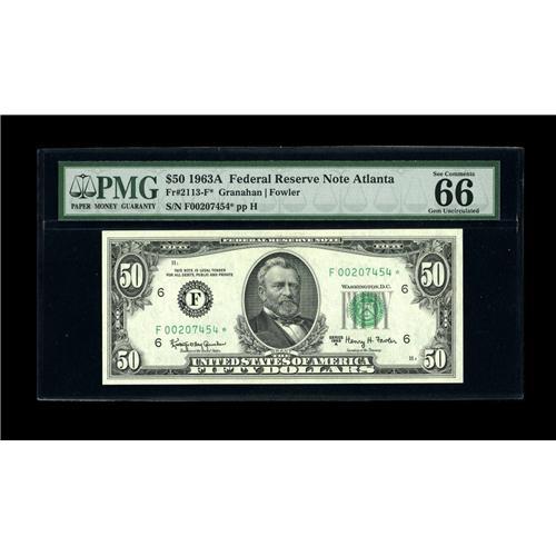 <B>Fr. 2113-F* $50 1963A Federal Reserve Note. PMG Gem Uncirculated 66EPQ.</B></I><BR>PMG comments "Exceptional Paper Quality" and one look at this beauty confirms that assertion. Hulking margins, bold embossing and exceptional eye appeal are found on this modern star which represents the highest observed serial number for the Atlanta district.<BR><BR><b>Shipping:</b> Coin/Currency (<a target="_blank" href="http://www.heritageauctions.com/common/shipping.php">view shipping information</a>)