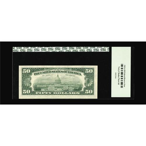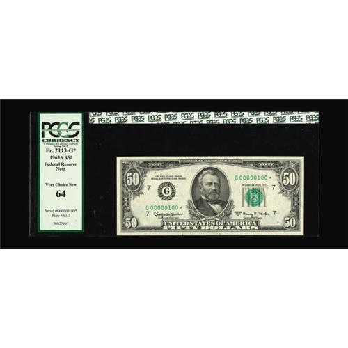 <B>Fr. 2113-G* $50 1963A Federal Reserve Note. PCGS Very Choice New 64.</B></I><BR>Serial number 100 adorns this $50 that seems just a hair off in centering to make the full Gem grade by the grading service.