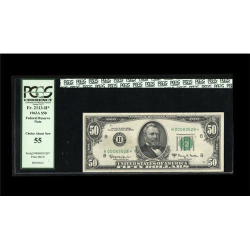 <B>Fr. 2113-H* $50 1963A Federal Reserve Note. PCGS Choice About New 55.</B></I><BR> A beautiful note from one of the scarcest districts, with a press run of only 128,000 examples.<BR><BR><b>Shipping:</b> Coins & Currency (<a target="_blank" href="http://www.heritageauctions.com/common/shipping.php">view shipping information</a>)