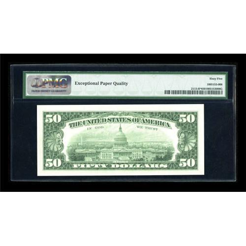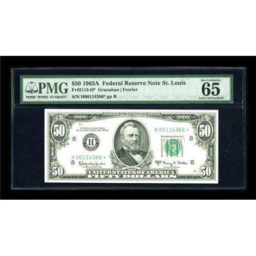 <B>Fr. 2113-H* $50 1963A Federal Reserve Note. PMG Gem Uncirculated 65 EPQ.</B></I><BR> A mere 128,000 stars were printed for release by the St. Louis district. This piece is among the finest, with ample margins and perfect paper quality.<BR><BR><b>Shipping:</b> Coins & Currency (<a target="_blank" href="http://www.heritageauctions.com/common/shipping.php">view shipping information</a>)