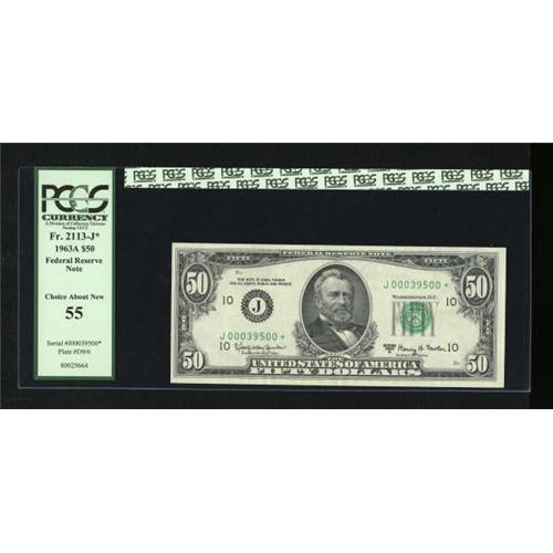 <B>Fr. 2113-J* $50 1963A Federal Reserve Note. PCGS Choice About New 55.</B></I><BR> We have seen only one other example of this Friedberg number in our auctions. This is also a new high serial number for the Schwartz-Lindquist reference.<BR><BR><b>Shipping:</b> Coins & Currency (<a target="_blank" href="http://www.heritageauctions.com/common/shipping.php">view shipping information</a>)