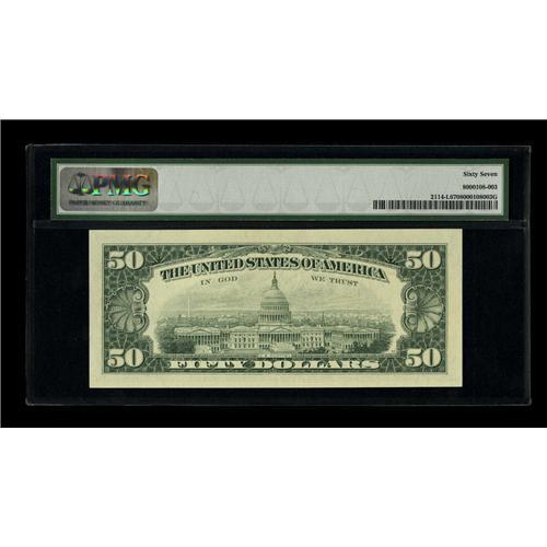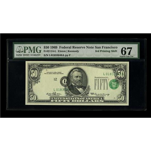 <B>Fr. 2114-L $50 1969 Federal Reserve Note. PMG Superb Gem Unc 67.</B></I><BR>A well margined example of a moderate shift on a denomination not prone to providing many errors.<BR><BR><b>Shipping:</b> Coin/Currency (<a target="_blank" href="http://www.heritageauctions.com/common/shipping.php">view shipping information</a>)