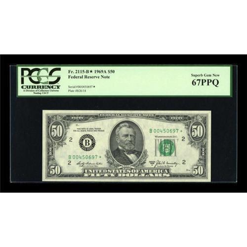 <B>Fr. 2115-B* $50 1969A Federal Reserve Note. PCGS Superb Gem New 67PPQ.</B></I><BR> This is not an exceptionally rare star in most grades, but we suspect that well-nigh perfect examples such as this Superb Gem New 67PPQ will always be difficult if not impossible to obtain. <BR><I>From The Thomas M. Flynn Collection</B></I><BR><BR><b>Shipping:</b> Coins & Currency (<a target="_blank" href="http://www.heritageauctions.com/common/shipping.php">view shipping information</a>)