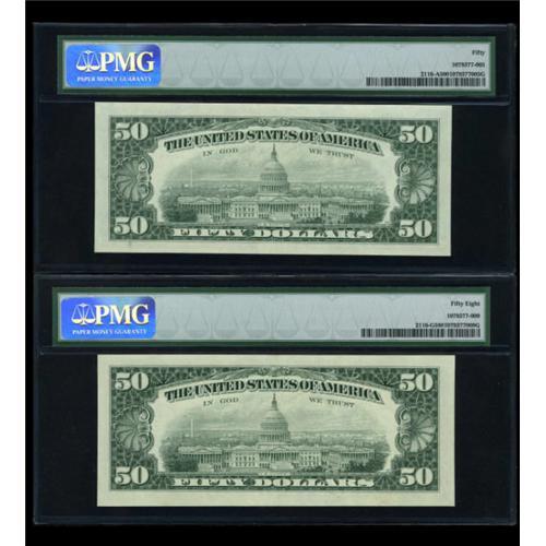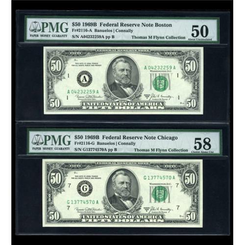 <B>Fr. 2116-A $50 1969B Federal Reserve Note. PMG About Uncirculated 50.<BR>Fr. 2116-G $50 1969B Federal Reserve Note. PMG Choice About Unc 58.</B></I><BR> Two pieces from the scarce 1969B series. <BR><I>From The Thomas M. Flynn Collection</B></I><BR><BR><b>Shipping:</b> Coins & Currency (<a target="_blank" href="http://www.heritageauctions.com/common/shipping.php">view shipping information</a>)