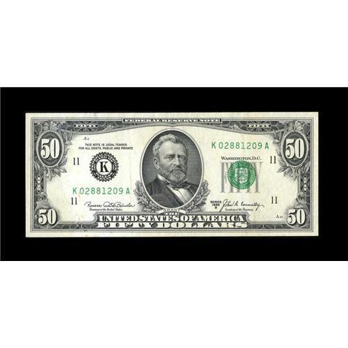 <B>Fr. 2116-K $50 1969B Federal Reserve Note. Extremely Fine.</B></I><BR>Huge margins and bright paper are found on this lightly circulated Dallas Fifty. This series is always a great challenge to locate in any grade and this example should fit the bill for the budget-minded collector.<BR><BR><b>Shipping:</b> Coins & Currency (<a target="_blank" href="http://www.heritageauctions.com/common/shipping.php">view shipping information</a>)