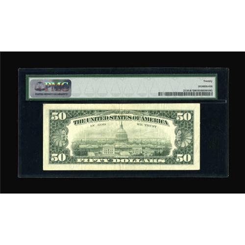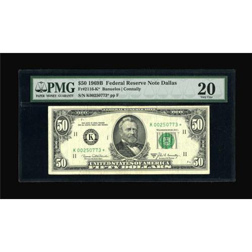 <B>Fr. 2116-K* $50 1969B Federal Reserve Note. PMG Very Fine 20.</B></I><BR> An attractive and evenly circulated example of this very scarce star that had a meager printing of only 128,000. A bright green ink overprint accentuates crisp and fresh paper surfaces. The Schwartz value of $1,000 in VF might be challenged when the hammer falls on this beauty.<BR><BR><b>Shipping:</b> Coins & Currency (<a target="_blank" href="http://www.heritageauctions.com/common/shipping.php">view shipping information</a>)